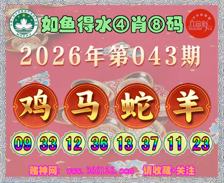 043期: ☺️《如鱼得水》 ☺️④肖⑧码☺️【鸡马羊】开:蛇13
