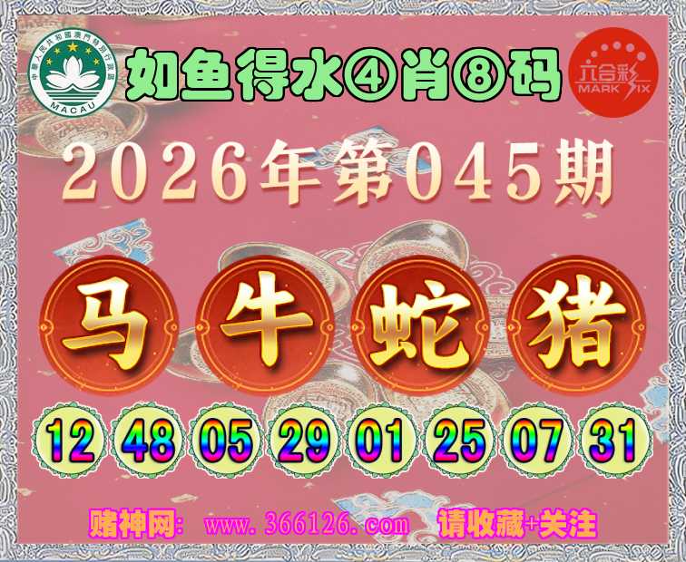 045期: ☺️《如鱼得水》 ☺️④肖⑧码☺️【马牛猪】开:蛇01