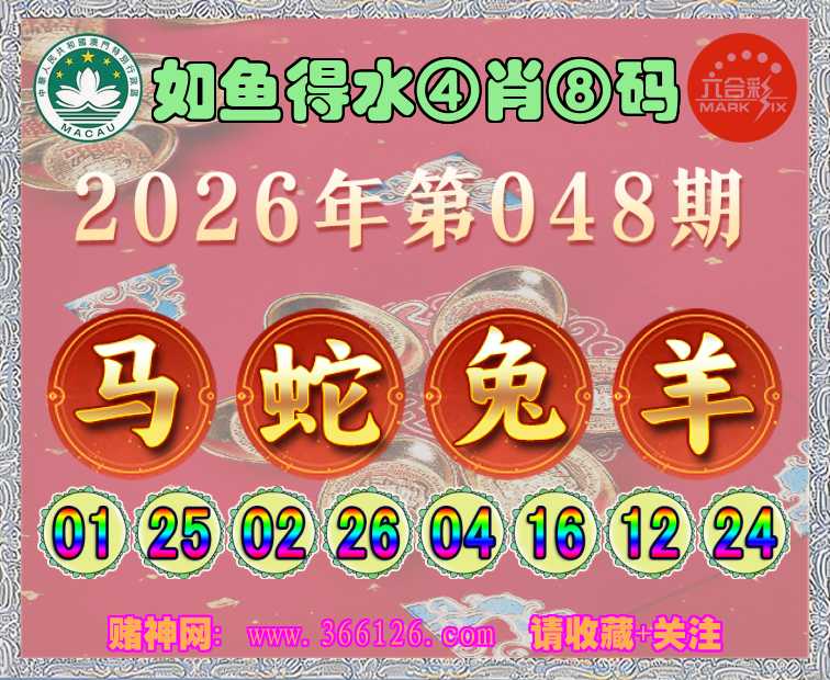 048期: ☺️《如鱼得水》 ☺️④肖⑧码☺️【马蛇兔】开:羊24