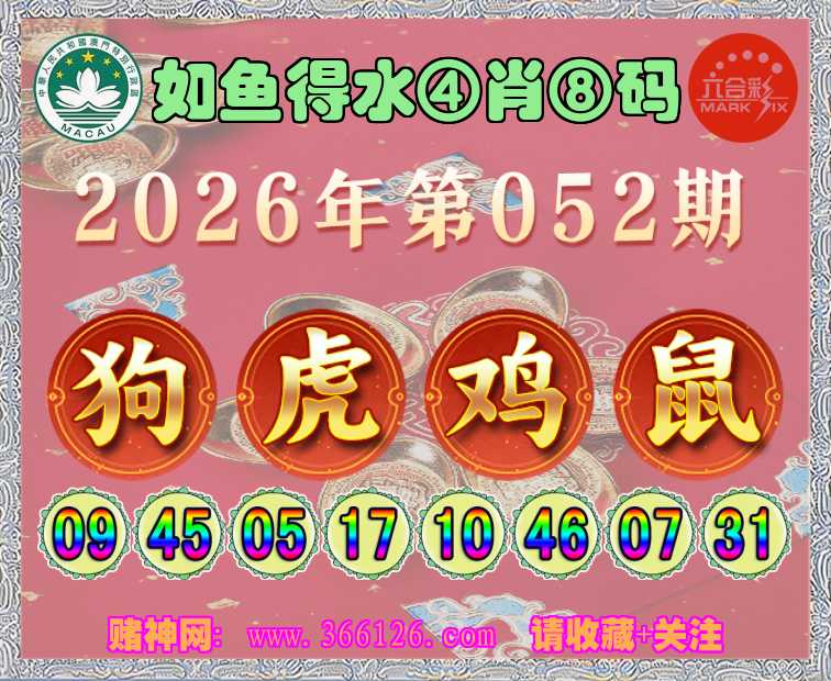 052期: ☺️《如鱼得水》 ☺️④肖⑧码☺️【狗虎鸡鼠】开:蛇38