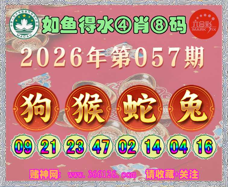 057期: ☺️《如鱼得水》 ☺️④肖⑧码☺️【狗蛇兔】开:猴23